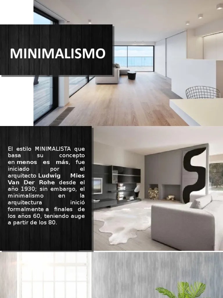 Es el estilo que busca liberar a la arquitectura de ornamentos excesivos dejando sólo lo necesario al usar elementos simples y rechazar las decoraciones... La arquitectura minimalista como su nombre lo dice tiene como objeto destacar lo "mínimo"less is more o menos es mas de ahí deriva el termino y la tendencia de conseguir mucho con lo mínimo indispensable; Ya no se trata de mostrarnos lo menos posible, se trata de que a la vez sea útil, confortable y que nos proporcione un placer visual de armonía que pocas veces encontramos en la arquitectura ….. ¿qué es la arquitectura minimalista?
